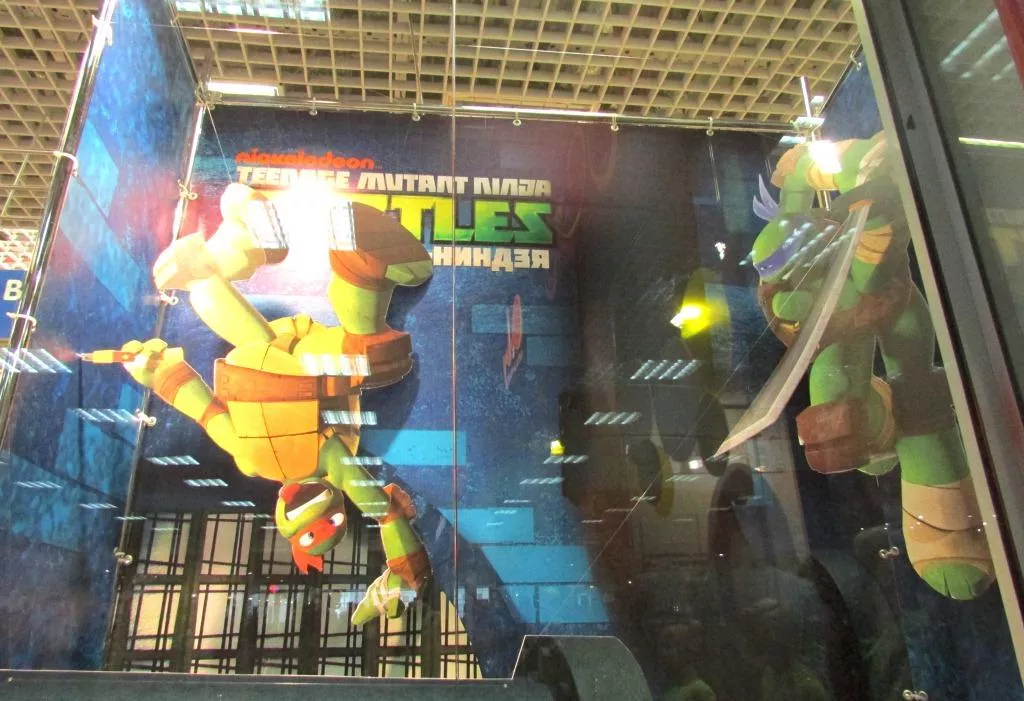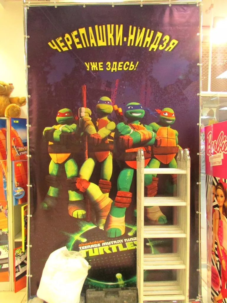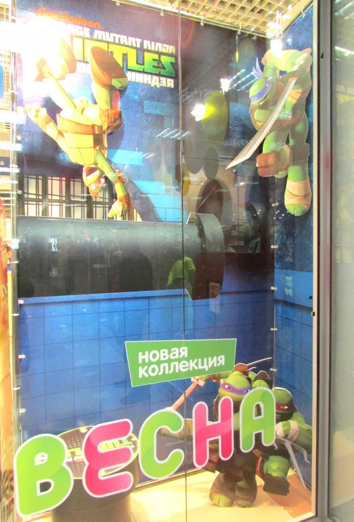 Задняя часть витрины оформлена баннером с люверсами, а впереди пластиковые фигуры известных мультипликационных героев.